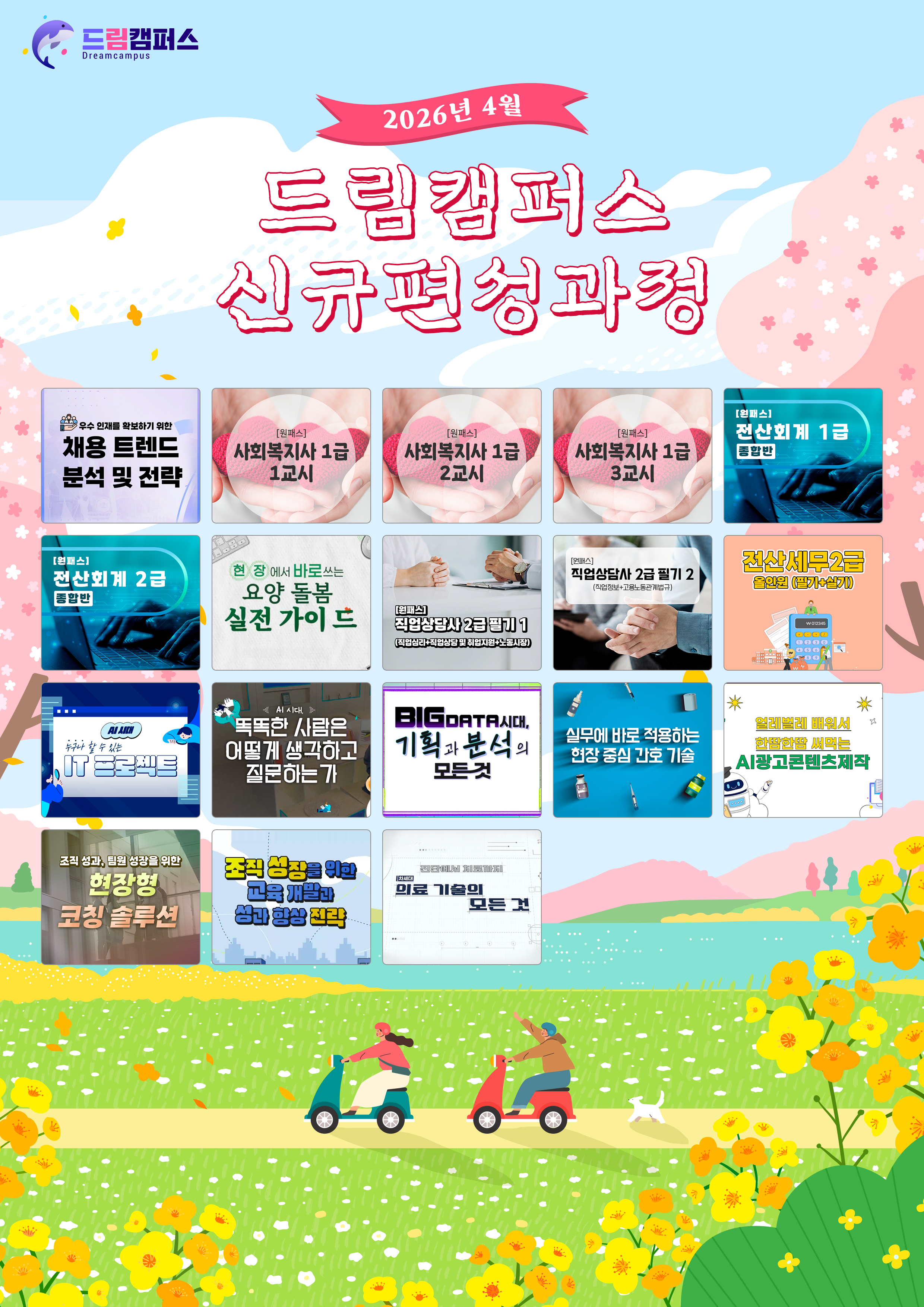 저희 드림캠퍼스는 4월을 맞아 여러분의 자기계발과 역량 강화를 돕기 위한 신규 교육과정을 개설하였습니다.